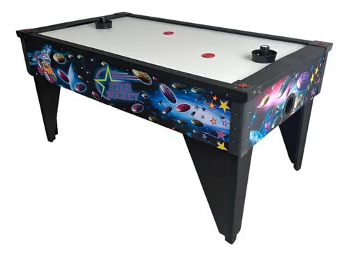 Como funciona: Um disco flutua sobre uma superfície com orifícios por onde passa ar, criando uma sensação de ausência de atrito. Os jogadores usam rebatedores para mover o disco e marcar gols no campo do adversário.